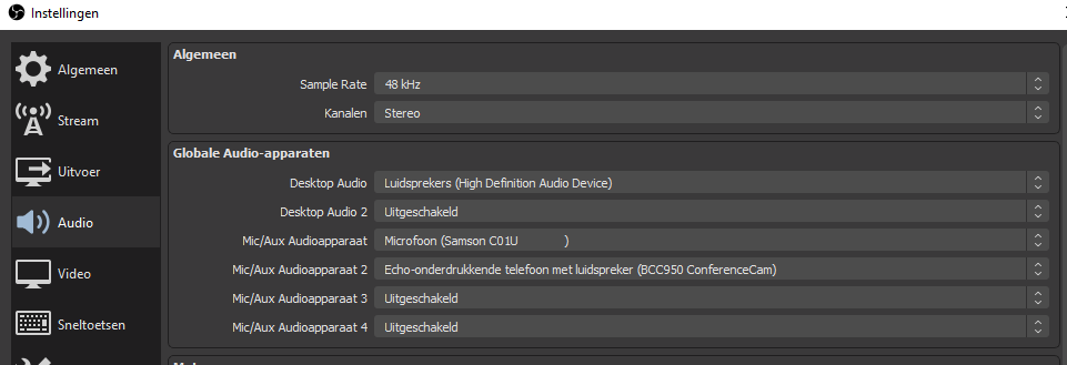 In OBS studio zit een optie bij Instellingen –> Audio om de apparaten die je wilt gaan gebruiken in te vullen.